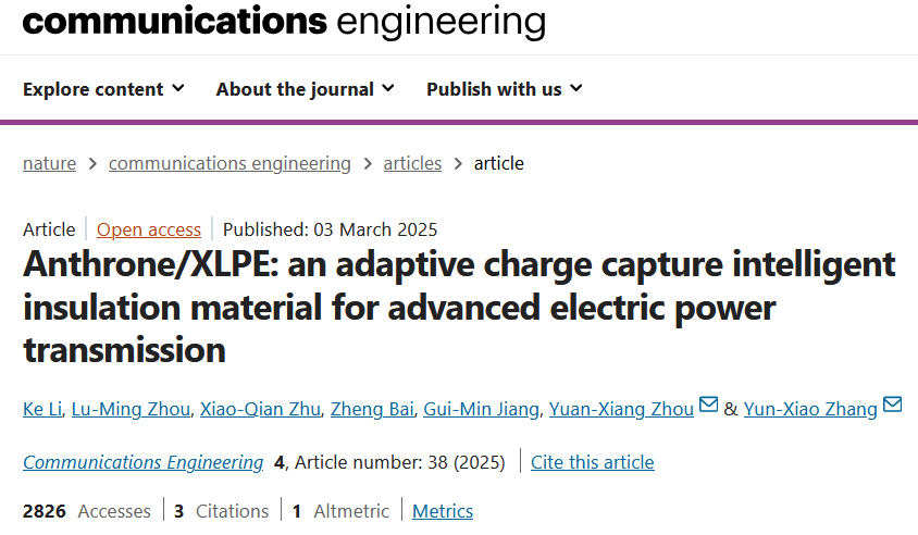 针对以上问题,开云kaiyun登录入口周远翔团队创新性地提出自适应电荷捕获(Adaptive Charge Capture, ACC)机制,利用极性有机半导体蒽酮(anthrone, ET)的介电泳迁移特性,在非均匀电场驱动下,实现在缺陷区域的靶向富集。通过构建界面电荷势垒和反向本征电场,可同步提升电荷注入势垒(电树起始电压提高123%)和场强均匀性(内部电场降低18%)。该研究工作以“Anthrone/XLPE: an adaptive charge capture intelligent insulation material for advanced electric power transmission”为题发表在Nature工程领域子刊Communications Engineering期刊上。
