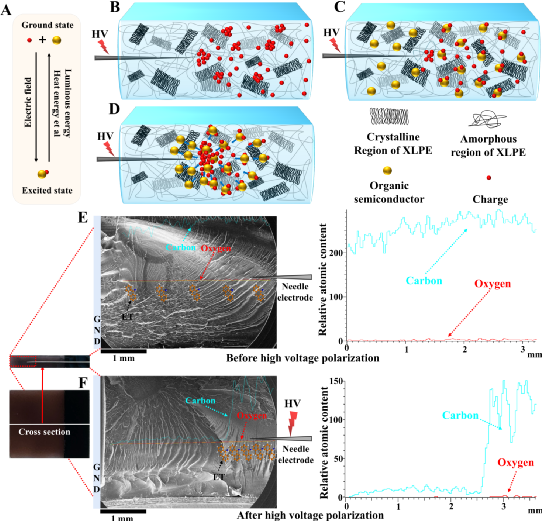 图4. 有机半导体/XLPE电树增强机制。(a)电子能量耗散过程。(b-d)高压下XLPE、蒽(EN)/XLPE和蒽(ET)/XLPE的电荷输运。在XLPE(b)中,快速的电荷注入和针尖处的积聚会导致绝缘损伤。在EN/XLPE(c)中,EN捕获电荷,阻碍运输并减少分子链损伤。在ET/XLPE(d)中,ET在梯度场作用下积聚在针尖附近,形成一个反向电场,削弱局部电场,增加电荷注入阈值。ET/XLPE在极化前(e),SEM图像和EDS结果显示碳和氧分布均匀,表明ET在XLPE中分布均匀。极化后(f),针状电极附近的碳和氧含量增加,表明针状电极附近ET积累。