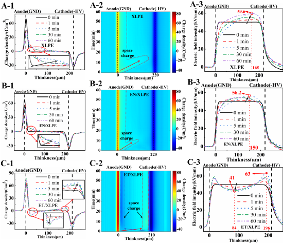 图1. (A)XLPE, anthracene (EN)/XLPE(B)和anthrone (ET)/XLPE(C)的空间电荷和电场分布