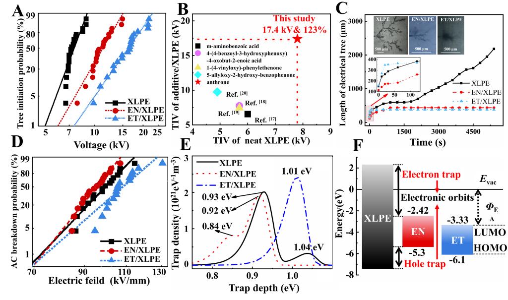 图2. XLPE、蒽(EN)/XLPE和蒽酮(ET)/XLPE的绝缘强度与物理化学性质:(a)电树起始电压;(b)XLPE及其复合材料的电树起始电压(TIV)对比;(c)电树长度随时间增长曲线及最终形貌示意图;(d)交流击穿强度;(e)基于表面电位测量的陷阱能级分布;(f)EN与ET的能带结构图。